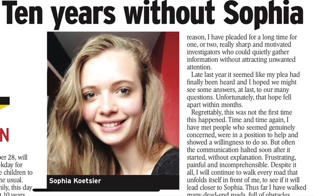 Gisteren, 28 oktober, betekende voor ons tien jaar zonder Sophia. Tien jaar van intens verdriet, wanhoop, onzekerheid, frustratie en machteloosheid, maar de hoop dat het mysterie op een dag wordt opgelost, blijft.