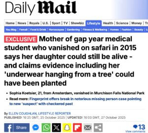 Tien jaar zonder Sophia – Daily Mail online oktober 27, 2025 De online versie van de Engels krant de Daily Mail heeft dit weekend een uitgebreid artikel gepubliceerd over Sophia’s mysterieuze Lees meer
